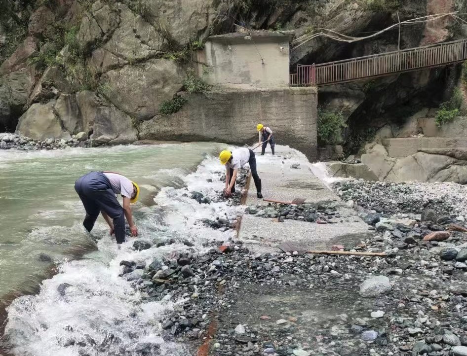 連日驟減的來水量迫使天彭電力鳳鳴湖水庫水位只能保持在低位運行。此刻,對保供者來說,每一滴來水都彌足珍貴,而做好引水工作就成為了保障發(fā)電生產(chǎn)和城區(qū)供水的重中之重。天彭電力上下聯(lián)動,全員作戰(zhàn),沙金車間、鳳鳴橋車間一線堅守責(zé)任到崗、迅速行動,頂著烈日清理底格欄柵壩壩面砂石、庫區(qū)進(jìn)水閘浮渣和前池淤積物,嚴(yán)格執(zhí)行“每日一小撈、三日一大撈、洪水天天撈”制度,做到多引水和保水源“兩手抓、兩手硬”,從源頭上守住保水保電的“生命線”。