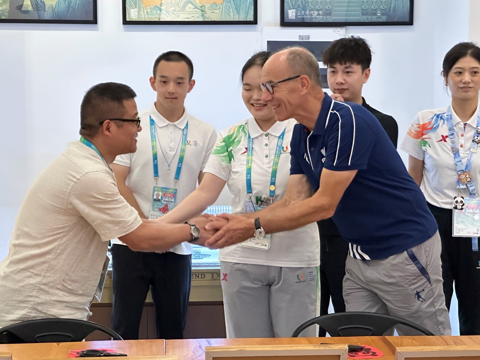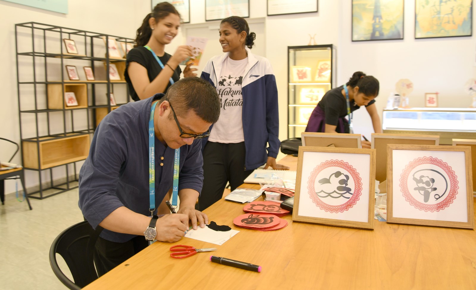 莊叢燦的剪影作品和其耐心負責的剪紙教學倍受運動員們“點贊好評”的同時,也吸引了國際大體聯和各國代表團人員前來“沉浸式體驗”。期間,莊叢燦為國際大體聯代理主席雷諾·艾德和意大利代表團官員彼得羅·伊瓦爾迪進行剪紙教學和剪影留念。