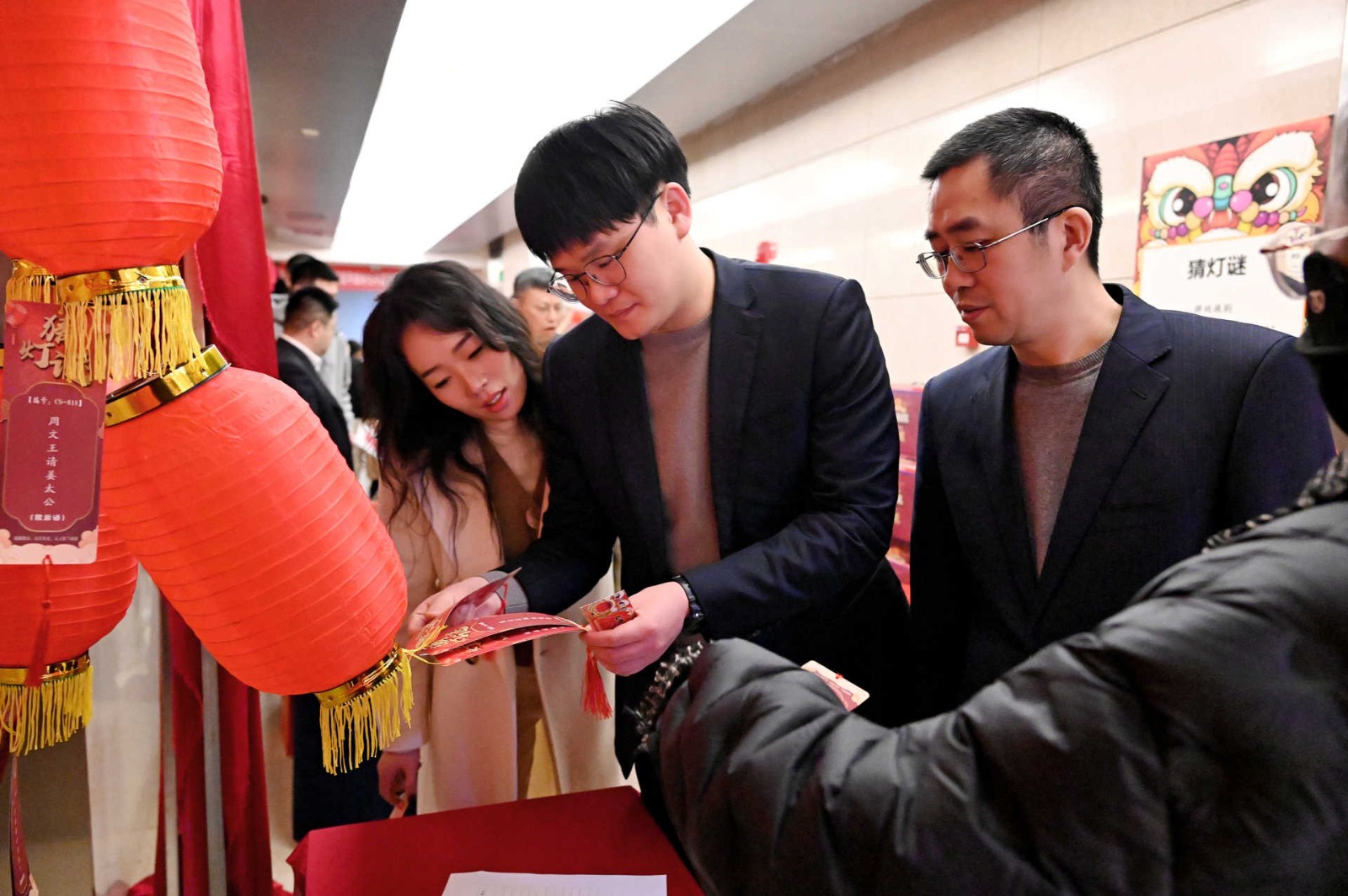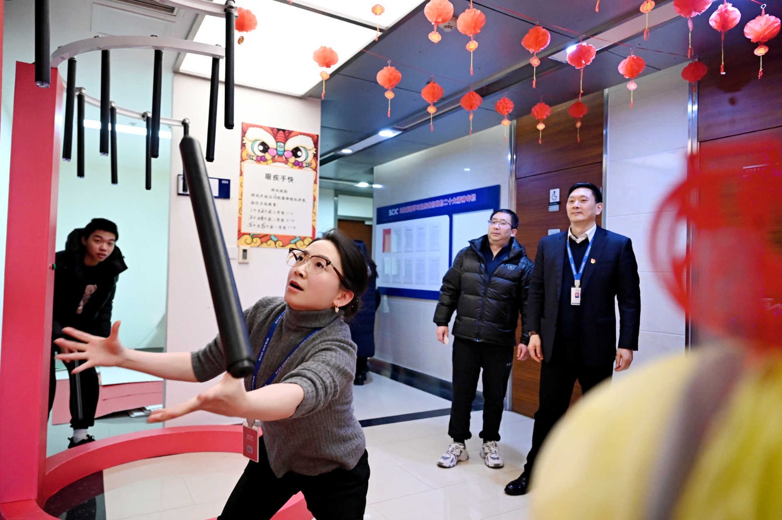 此次活動采用游園方式,現場設置了民俗體驗區、非遺手作區、民俗體驗區、新春互動區、游戲互動區等5個活動區域,涵蓋猜燈謎、剪窗花、做龍燈、滾滾樂等8個活動。活動現場每一處都用心裝扮,火紅的中國燈籠、精美的傳統對聯伴隨濃郁的新年味道彌散在會場的每一個角落。大家爭先恐后、玩勁十足,盡享新春的熱鬧與喜悅!有的圍著掛著紅線繩的燈謎卡片,仔細閱讀謎語,認真思考,沉浸在猜謎的樂趣中;有的圍在四川剪紙非遺傳承人莊叢燦老師周圍,一邊聆聽著剪紙的技巧,一邊仔細修理邊角,用心精雕細琢;有的在學習制作龍燈,他們展現出極高的熱情和創造力,根據自己的想象,給龍燈增添了各種裝飾,如彩紙、亮片等,使得每個龍燈都獨具特色。