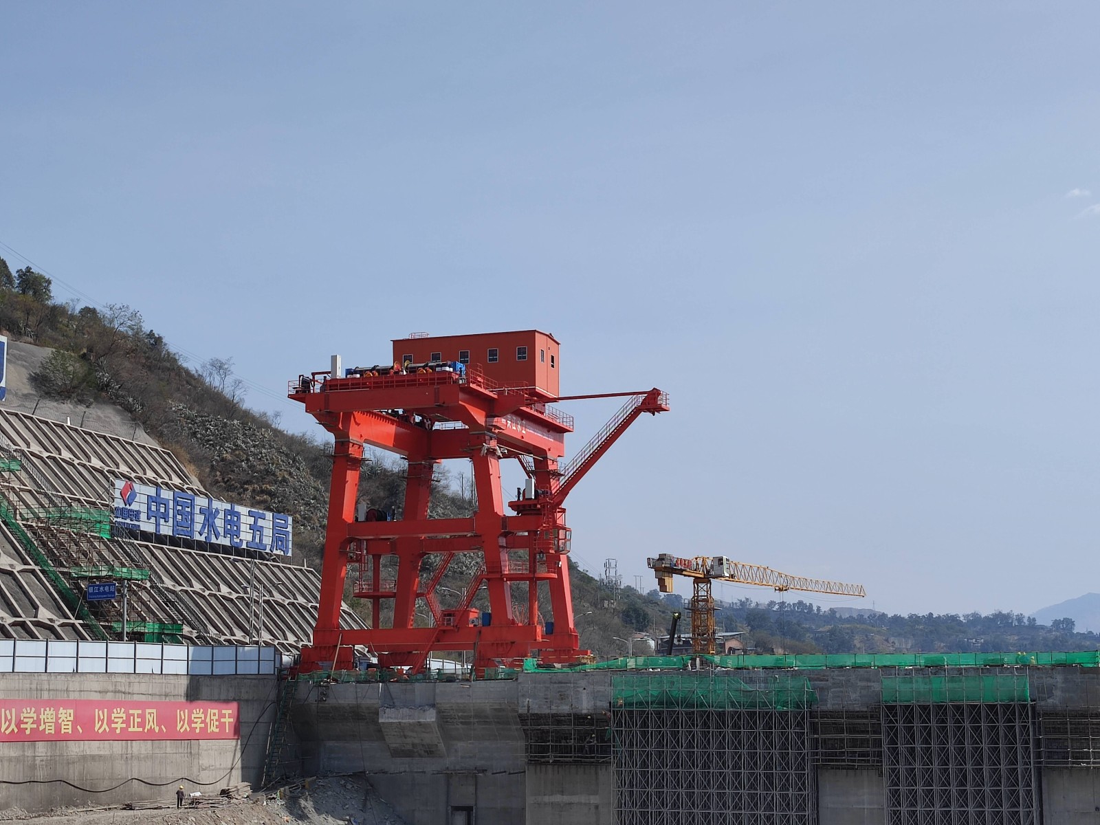 紅色門機迎江矗立。“大吊車真厲害,百噸設備輕而易舉提抓起來!”今年以來,攀枝花廣大市民陡然發(fā)現銀江水電站大壩上架起了一個紅色的大型設備,從幾公里外的市區(qū)一眼望去就能映入眼簾,成為銀江水電站的新標志。這個紅色巨物就是壩頂門機,高25米,寬16米,最大起吊能力達到500噸,起升高度達75米。是水電站建設期金屬結構安裝及后期電站運行最重要的設備之一,2024年將肩負起包括36扇閘門在內共計超萬噸的設備起吊任務。為順利推進施工,開年以來,川投能源攀水電公司通過增加臨時軌道提前籌備、堅持春節(jié)不停工等措施,加快實施壩頂門機供貨安裝,計劃4月中旬投入使用。