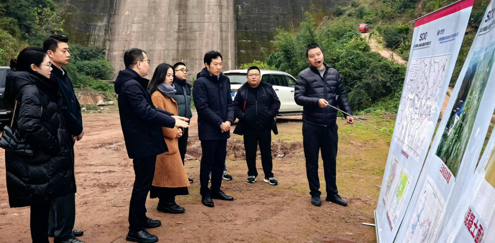 會前,戴月洪一行前往宜賓屏山書樓電站項目進行現場調研,在下水庫壩址位置聽取了項目總體布置情況匯報,在項目補水點和保寧村堆料場進行了現場踏勘,詳細了解了項目現場工作開展情況。