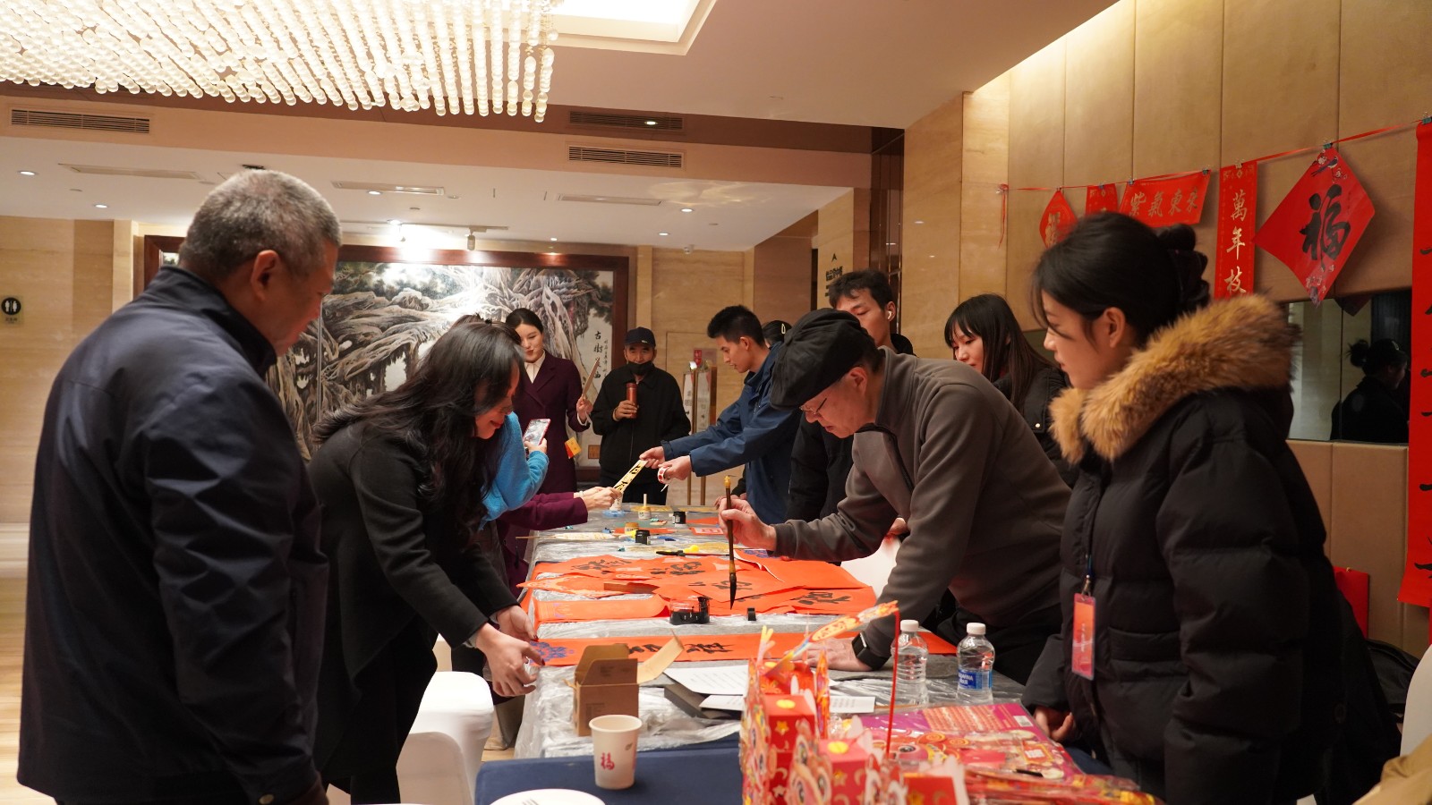 案桌上,筆墨凝香,職工們紛紛揮毫潑墨,現(xiàn)場創(chuàng)作了一幅幅新春對聯(lián)和剪紙畫。紅紙黑字,一個個“福”字躍然紙上,風格多樣的春聯(lián)傳遞著溫暖與喜慶。每一筆、每一劃都融入了職工們對新春的祝福與美好期許,為即將到來的新年增添了濃厚的文化氛圍。