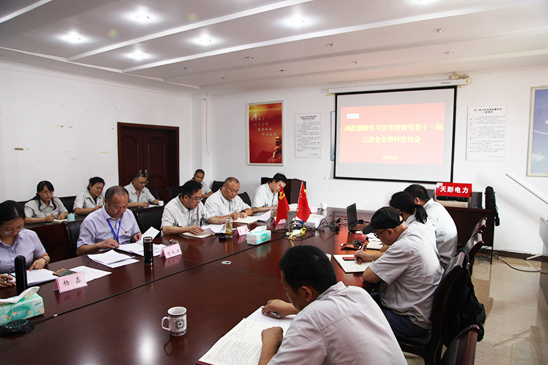 為推動省委十一屆三次全會精神宣貫活動深入開展,確保省委決策部署不折不扣落到實處, 8月8日,按照川投能源黨委的統一部署,黨委副書記、工會主席陳長江率黨群部副主任楊鑫一行赴天彭電力宣講省委十一屆三次全會精神,為天彭電力黨員干部和員工上了一堂生動的黨課。會議由天彭電力黨總支書記、總經理楊濤主持,天彭電力全體干部、黨員和員工代表共計28人參加了宣講會。