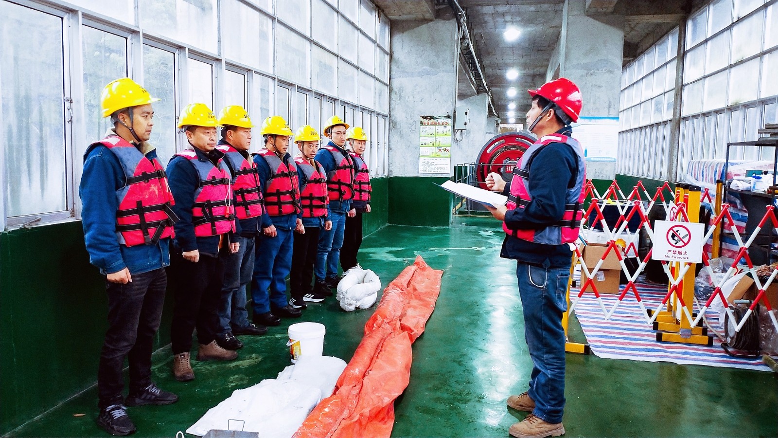 演練以局部湖面水質(zhì)污染為背景,采用現(xiàn)場(chǎng)模擬形式進(jìn)行。上午9:30分,鳳鳴湖大壩1#、2#、3#弧形閘門全關(guān),進(jìn)水閘門全開,大壩引水隧道正常通水,鳳鳴橋站單機(jī)運(yùn)行,當(dāng)值運(yùn)行人員巡視檢查中發(fā)現(xiàn)庫區(qū)湖面局部污染,按公司《突發(fā)環(huán)境事件應(yīng)急預(yù)案》,“險(xiǎn)情”于第一時(shí)間傳達(dá)至當(dāng)值班長(zhǎng)、車間主任和公司應(yīng)急領(lǐng)導(dǎo)小組,同時(shí)車間迅速啟動(dòng)防水環(huán)境污染事件應(yīng)急預(yù)案,各項(xiàng)應(yīng)急處置流程迅即有序進(jìn)行,沙金車間封堵控制滲漏源,鳳鳴橋車間立即停機(jī)關(guān)閉蝶閥,搶險(xiǎn)人員緊急使用攔油索、吸油棉及工器具阻擊水面油污擴(kuò)散,經(jīng)過各方爭(zhēng)分奪秒通力配合,湖面滲漏油全部打撈處置完畢,成功處置了這起“突發(fā)水環(huán)境污染事件”。