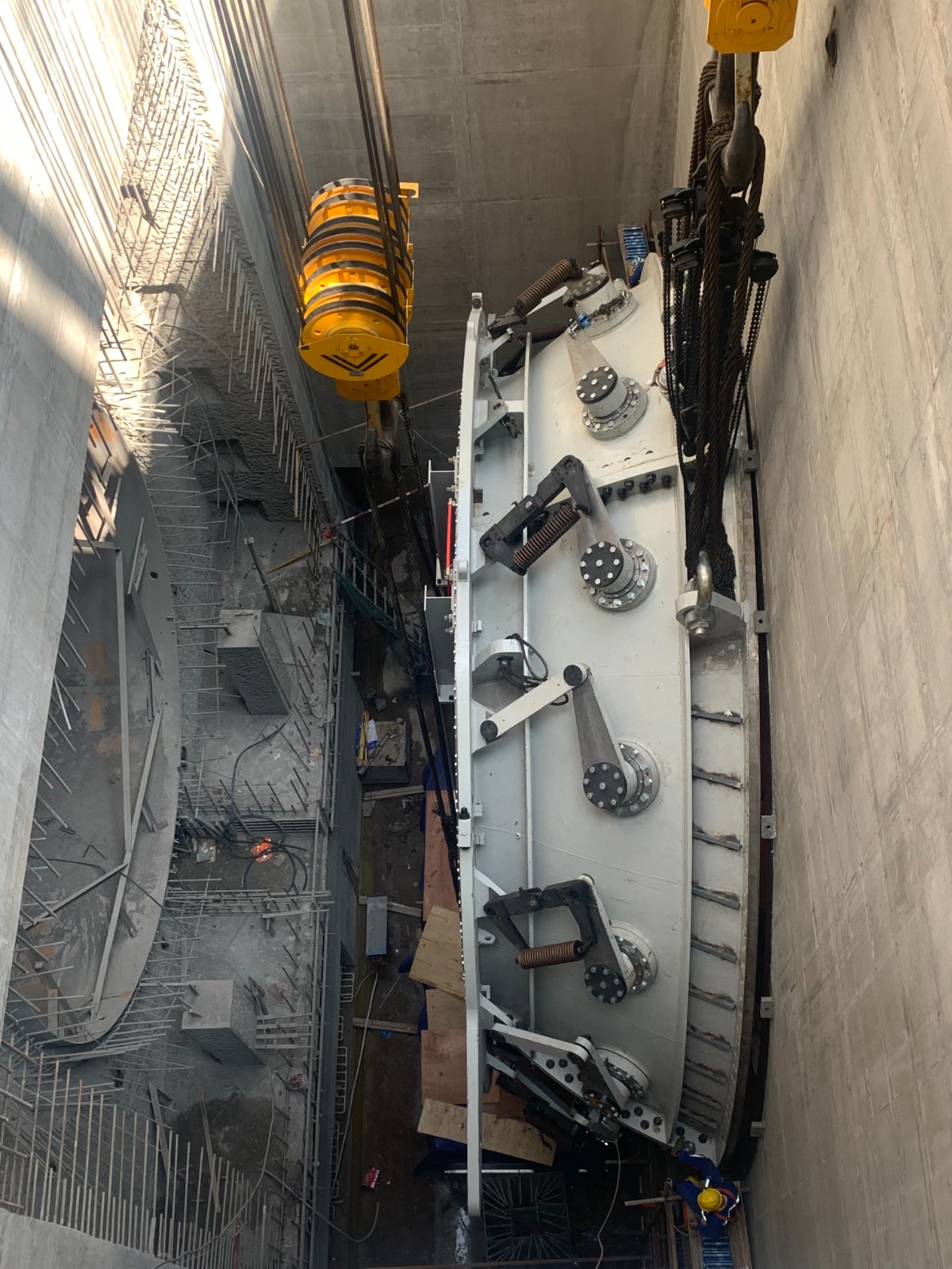 導水機構是控制銀江水電站機組流量的重要部件,對機組運行整體穩(wěn)定性和安全性至關重要。其總重量256.8噸,外配水環(huán)上游法蘭面最大直徑為11.8米,內配水環(huán)上游法蘭面最大直徑為5.6米。因導水機構尺寸大、重量大、施工場地受限,導致導水機構整體翻身非常困難,前期在總體方案設計時,明確提出在外配水環(huán)-Y方向的兩側安裝兩個翻身靴,確保導水機構平穩(wěn)翻身。攀水電公司提前組織相關參建單位召開導水機構安裝危大工程專項施工方案評審會,詳細討論了吊裝各環(huán)節(jié)注意事項,并提前部署安排相關準備工作。