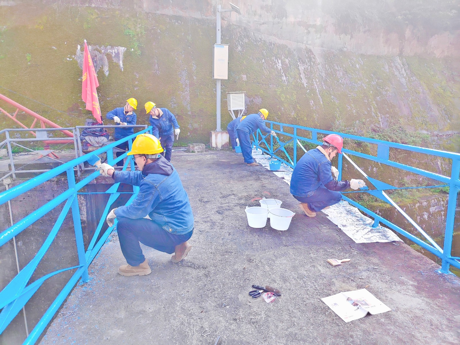活動開始前第三支部黨員進行了充分的準備和周密的分工,大家各司其職,迅速就位。刷漆過程中,有的負責初步清理護欄銹跡和污垢,為后續刷漆做好充分準備;有的則手持油漆刷等工具,細致地為護欄和金屬結構一遍遍涂上新的油漆。無論是經驗豐富的老員工,還是朝氣蓬勃的青年黨員,都干得熱火朝天。原本銹跡斑斑的近千米護欄和金屬結構逐漸煥然一新,為鳳鳴湖水庫增添了一抹亮麗的色彩。