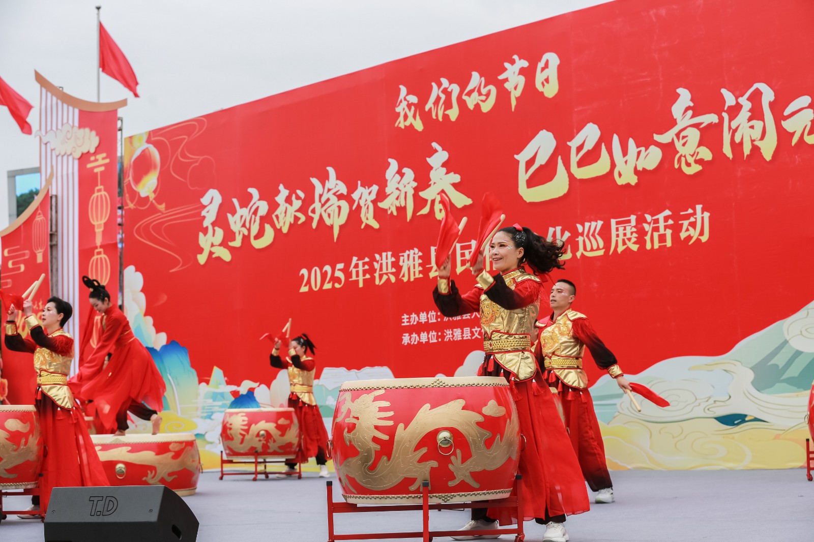 洪雅民俗文化巡展活動是洪雅縣每年春節期間的傳統文化品牌,表演節目豐富多彩、精彩紛呈,深受全縣人民喜愛。活動當日,民俗文化巡游隊伍從三彩廣場出發,一直到洪雅廣場,現場人頭攢動,熱鬧非凡。隨著激昂的鼓點響起,大鼓隊員們手中的鼓槌上下翻飛,富有節奏感地敲擊著大鼓。磅礴的氣勢、靈動的韻律、美妙的舞姿瞬間點燃了現場氣氛,吸引了眾多市民駐足觀看、拍手稱贊。