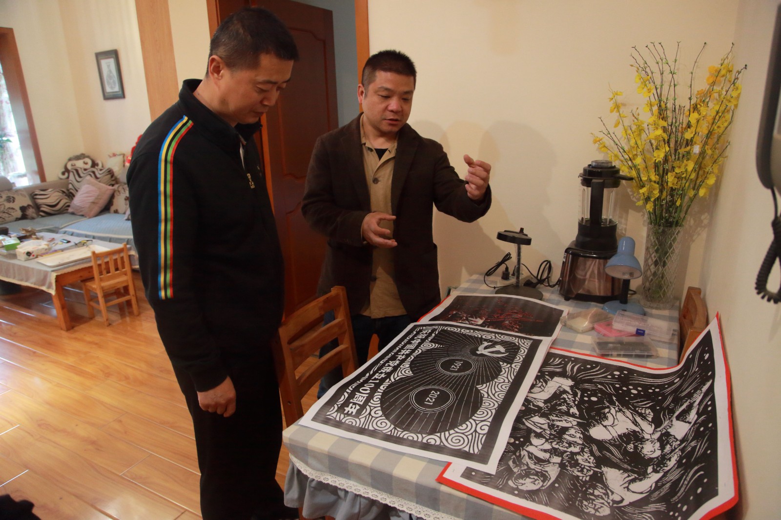 楊超龍?jiān)敿?xì)詢問(wèn)了剪紙創(chuàng)作的工期安排、當(dāng)前進(jìn)展,共同探討了作品創(chuàng)作構(gòu)思、整體構(gòu)圖、內(nèi)涵要義和各種藝術(shù)表現(xiàn)手法的選擇,并參觀了莊叢燦歷年的剪紙作品及創(chuàng)作工具。并向莊叢燦及其團(tuán)隊(duì)指出,要以黨史學(xué)習(xí)教育為契機(jī),認(rèn)真梳理、統(tǒng)籌謀劃、精心設(shè)計(jì)、用心創(chuàng)作好主題作品,通過(guò)完整的構(gòu)架、巧妙的構(gòu)思、精美的構(gòu)圖展現(xiàn)黨的百年光輝歷程,歌頌黨的百年豐功偉績(jī)。楊超龍鼓勵(lì)莊叢燦要在創(chuàng)作中傳承發(fā)揚(yáng)黨的光榮傳統(tǒng)和優(yōu)良作風(fēng),精誠(chéng)團(tuán)結(jié)、艱苦奮斗、攻堅(jiān)克難,以剪紙藝術(shù)凸顯川投能源的特色和亮點(diǎn),獻(xiàn)禮建黨100周年。